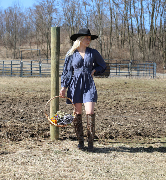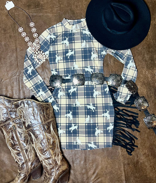 PLAID COWGIRL PRINTED LONG SLEEVE DRESS W SIDE FRINGE