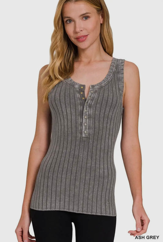 Zenana Washed Ribbed Scoop Neck Henry Tank Top in Ash Grey
