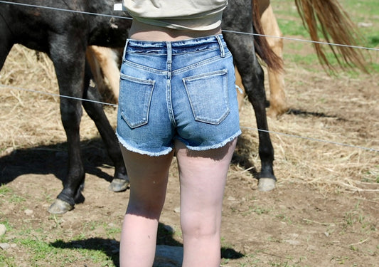Petra153 High Rise Stretch Patched Short w/ Frayed Hem