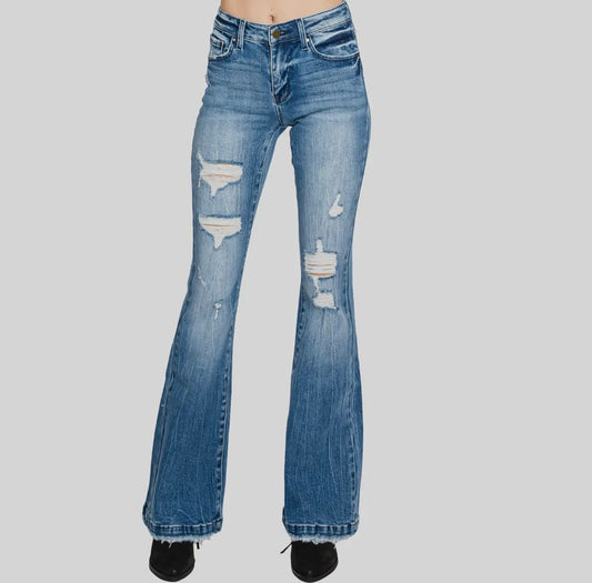Petra153 Distressed Mid Rise Stretch Flare Jeans