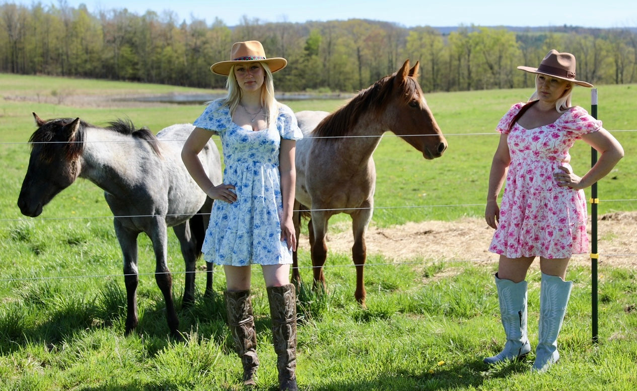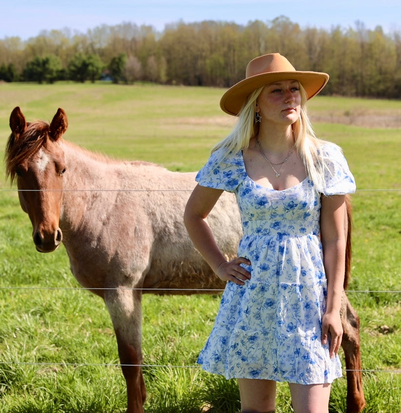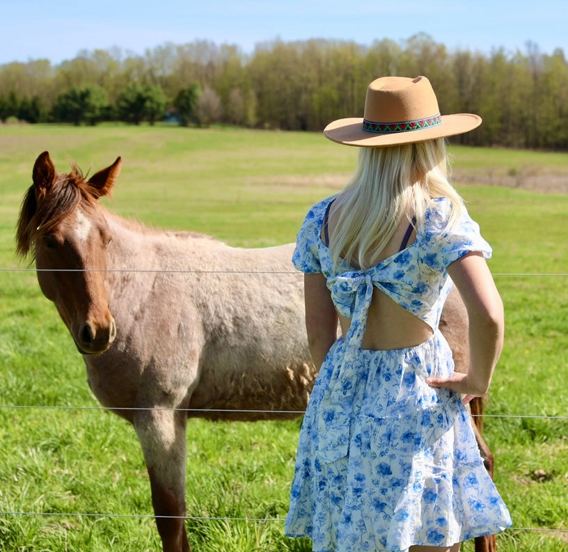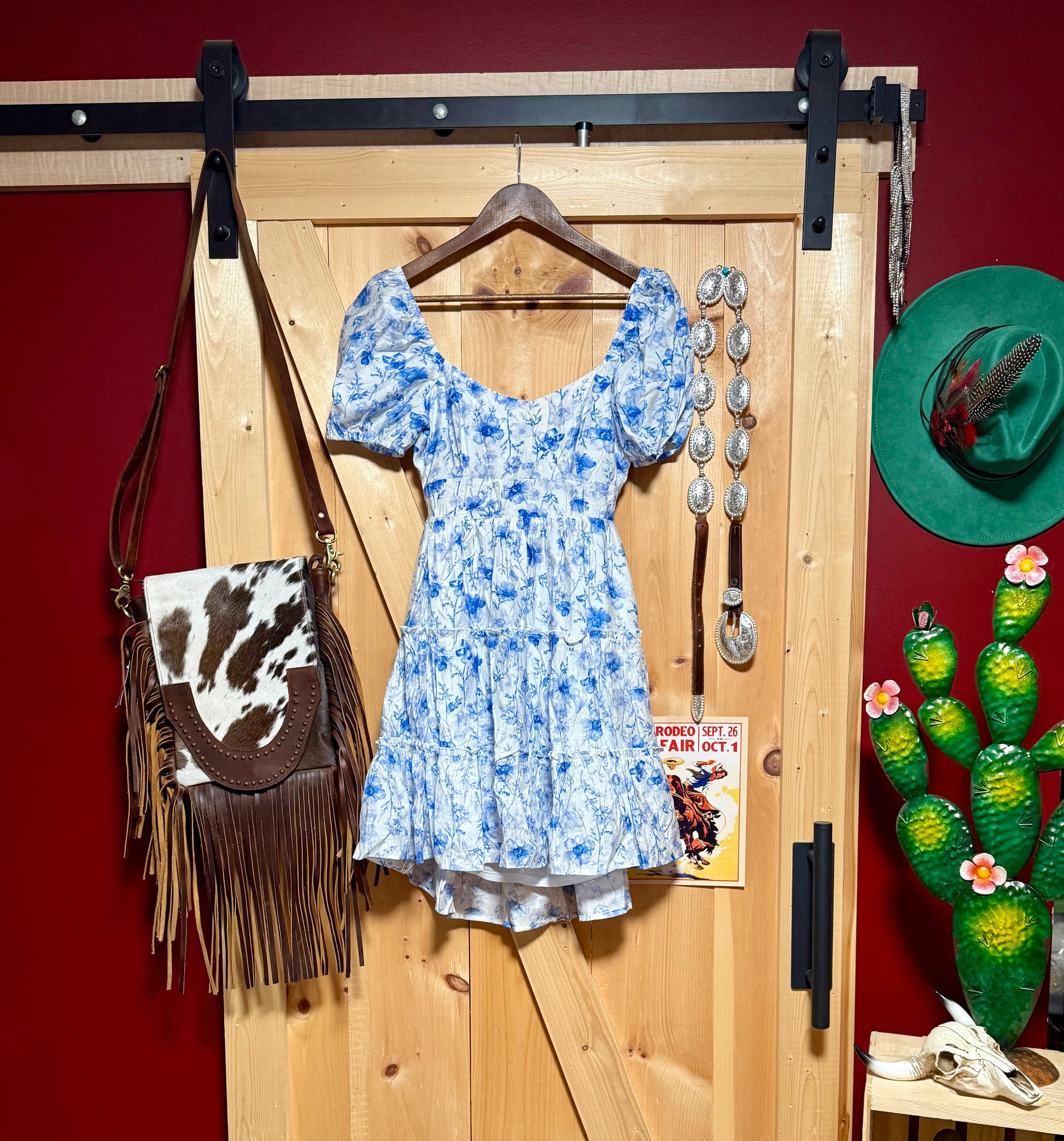 Blue Floral Open Back with Tie Tiered Mini Dress